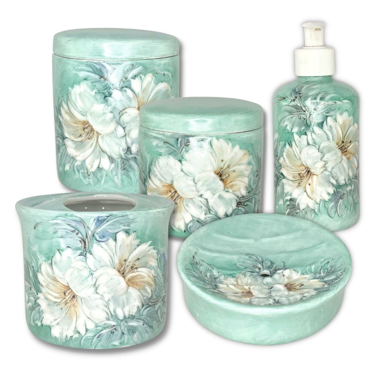 Kit Higiene de Banheiro 5 Peças de Porcelana Pintado à Mão AZALEIA BRANCA/TIFFANY